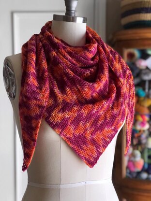 This shawl is worked side-to-side, with long chains sporadically extending the bottom edge until the full depth is achieved. At the midpoint, the extending chains cease and instead some stitches will be left unworked at the beginning of each decreasing section to bring the shawl back down to a point at the other end.
