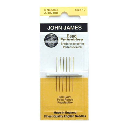 This set of John James Beading Needle, Ball point, 10 is just what you need to attach gorgeous adornments such as beads or sequins to your embroidery project. The ball point helps to ensure that you don’t split the fibers of your fabric in the process. Six needles in each packet.