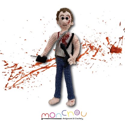 This Christmas movie icon is worked in worsted weight yarns, has wired limbs, a walkie-talkie, machine gun, and a bloodied shirt.