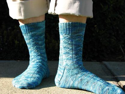 A basic sock with a complicated look. The panels are created by increasing and reducing stitches, no cables. The goofy name is from my mother, who stands at the front porch and waves every time I leave her house. Those are her feet, doing just that, in the photo.