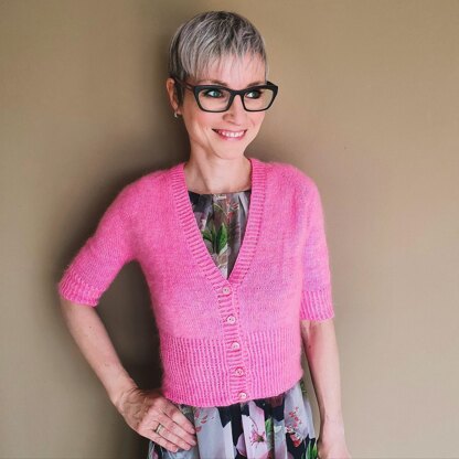 The cropped cardigan is worked back and forth in rows from the top down with a seamless raglan constuction.