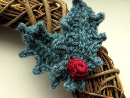 YARN: Any yarn can be used, the photographs show holly leaves made using a 3.5mm hook and double knitting weight cotton. I used Blacker Yarns West Country tweed to make my 2018 Holly Wreath (you can find photos on my website); it has a lovely rustic texture and holds its shape well. Experiment with different shades of green and different yarn textures.