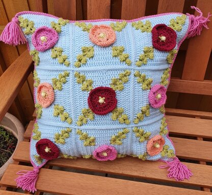 Inspired by the Hollyhocks amongst the cottage garden flowers at the front of the windmill in the village where I live, this cushion brings an extra touch of summer to your garden or home. The green spikes of buds against a sky blue background are complemented by the distinctive colourful flowers. It also features a granny square back and the cushion is adorned with tassels to finish it off perfectly.