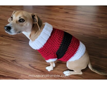 No seams to sew with this cozie pullover sweater. Loose, wide neck style. Quick and easy to crochet. Comfortable fit. Folded collar for convenient leash attachment. Keep your pup warm and cheerful. Just enough under-belly clearance and short sleeves for clean potty breaks.