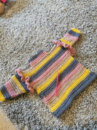 A simple jumper made in sections and joined together with added jazz with ruffled sleeves or leave off for a boy