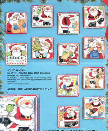 By Linda Gillum. See Santa Skate. See Santa Smile. See Santa snuggle his reindeer. A jolly Santa certainly brings a smile to anyone’s face. Twelve smiling Santas are here for you to stitch as ornaments or even greeting cards to send to a special loved one who needs a smile to brighten their day.