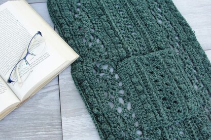 The Josephine Pocket Scarf is the third item in the Josephine Collection, which is named in honor of my mom. The other two items are the Josephine Shawl and the Josephine Blanket. Both of these patterns are available on Ravelry and my website. This crochet pocket scarf features a lacy, textured pattern with pockets that blend in with the design. It is approx. 12” wide so it lies perfectly over your shoulders and arms without slipping off. The length is approx. 65.5” long including the fringe. There are added instructions to make it a wider shawl width.