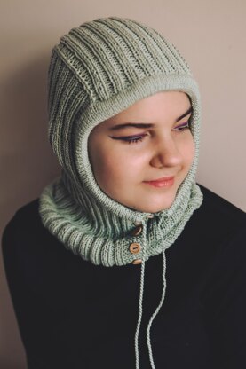This balaclava is knit all flat. There is no knitting in the round at all. This balaclava is knit flat. It is knit bottom up, and the drawstring tunnel is added afterward.