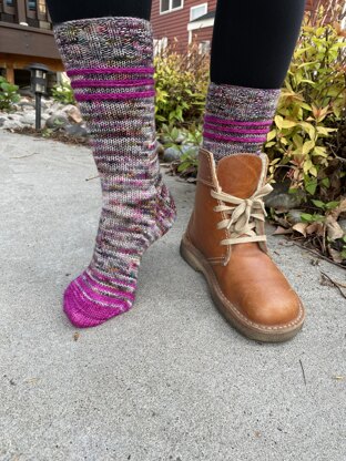 This is a top-down sock with a traditional heel flap. It is worked using magic loop; needle 1 will be the front of foot/instep/leg, and needle 2 will be the back of foot/leg and heel. Sized from child to large adult these are perfect socks for the whole family.