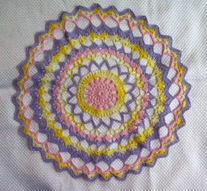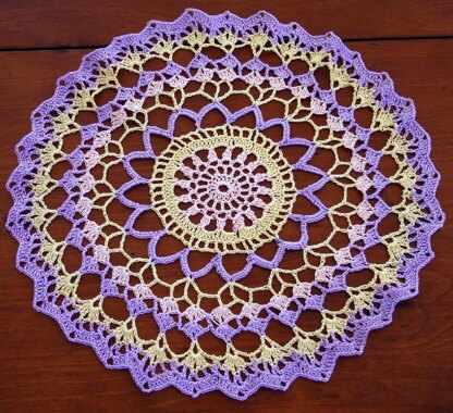 This lovely little doily can be made in three spring colors as shown or make it in a color of your choosing to match any decor. The lacy pattern works up quickly and is easy for those with just a bit of doily making experience yet includes a few different stitch combinations for those wanting to try something new.