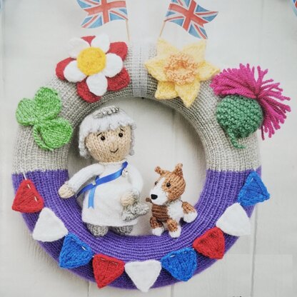 In 2022, Her Majesty Queen Elizabeth II became the first British Monarch to celebrate a Platinum Jubilee, 70 years of service. This knitted wreath celebrated the occasion, decorated with bunting flags, and the national flowers of the four nations: English rose, Welsh daffodil, Scottish thistle and Northern Irish shamrock. Use elements from the wreath to make future jubilee memorabilia such as brooches and hairbands.
