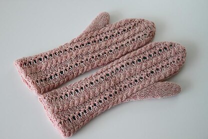 Julia mitts is a pair of double layer mitts that is reversible. On the outside, you have a pretty cable pattern on the inside, you have a simple stockinette layer.