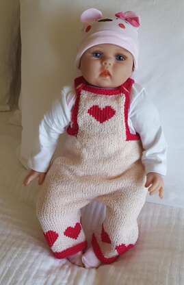 These baby’s 8ply bib and braces overalls are knitted in two colours then heart motifs are embroidered (working form a graph) at the ankles and chest.