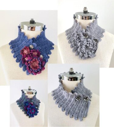 The Juliette Floral Collar Scarf features a scalloped edge with a floral touch. The Juliette scarf can be made in a solid colour, multiple colours or without the flowers for a more contemporary style. Inspired by the romantic designs of the Victorian era while walking along an English Garden admiring the flowers along the path. Fingerling weight yarn. Written in US terminology.
