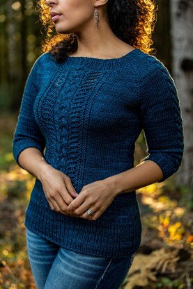 Julissa is a modern raglan pullover knit seamlessly from the top down using a worsted weight yarn. A wide neckline, striking cable and lace details, three‑quarter length or full-length sleeves (your choice!), and a bit of waist shaping all together create this feminine, easy-to‑knit top. Short rows are used to lower the front neckline for a comfortable fit, and instructions are also provided for adding bust darts, if necessary. Wear this beautifully fitted sweater with your favorite pair of jeans and a complementary colored tee or tank top underneath.