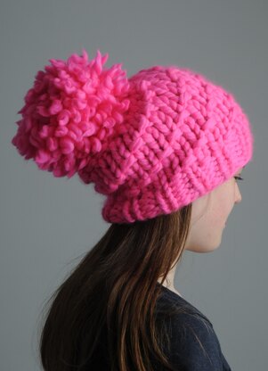 This fabulous hat really makes a statement (especially if it is knitted in Bubblegum!). Knitted in 'super' super chunky Podgy  yarn it is wonderfully light, supremely warm and stupidly quick to make! You just need one skein of yarn for the hat, but an additional one if you want the fabulous pompom on top! The simple stitch pattern spirals round and round to the top of the hat so once the pattern is set you can just keep going until the decrease.