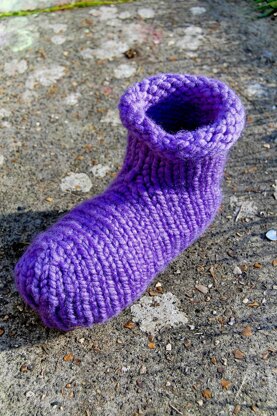 Slippers are meant to be easy to make: and these are so simple and fast to make that they are no bother at all. They also have the advantage of an interesting and novel construction; top down, in the round and seamless yet with no picking up of stitches or short rows and no heel to turn. Just knit all the way.