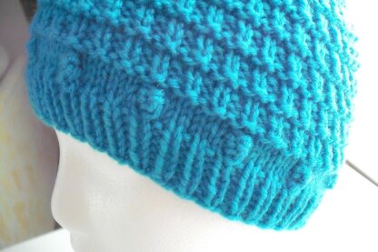 This is a child size hat with a row of bobbles above the brim. The bobbles are worked on the reverse side using a wrap and turn stitch.