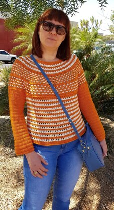 I would like to suggest crochet a two-tone jumper “Summer day”. This two-tone crochet jumper “Summer day” has a circular yoke and is crocheted from the top down using clear charts and written instructions. There are two options for designing armholes: for long sleeves and short sleeves. Materials: 100% mercerized opal cotton 678 meters in 100 grams (CIRCULO, QUEEN 8) (crochet with yarn held double). Used yarn of two colors – white (130 grams) and orange (400 grams). Size: 48-50 (not difficult to calculate according to your size). Difficulty: Intermediate. Crocheting two-color patterns is a fast and engrossing process. I'm sure you will like it. Best regards, Nataliya