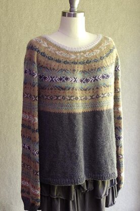 Juneau is knitted in one piece seamlessly from the top down with a stranded yoke and sleeves, and single-color knitting for the lower body. Wrapless short-rows shape yoke. Small provisional cast-ons are worked at the underarms.