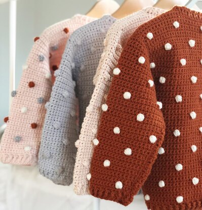 This pattern is a mini version of my women's A Whole Dot of Love Jumper, designed with the same stitches and shape and including a round neck. It is unisex. The sizes correlate to a child's age so that ages 1 - 12 are covered. The pattern uses DK/8ply/light weight yarn and a 4mm/G hook, or hook to suit gauge.