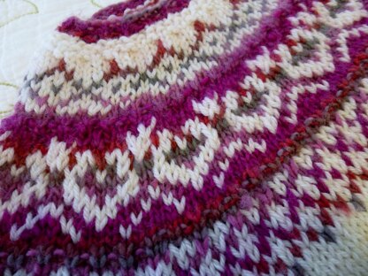 These pullovers are worked from the bottom up, beginning with a tubular cast on in a contrasting color. Short rows are used to give a slight shirttail effect to the bottom of the adult sweater. The stranded yoke patterns, while not identical in the adult/child versions, are scaled to work well with their respective sizes.