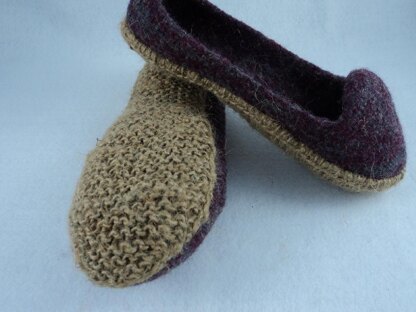 The soles are knitted on straight knitting needles size 6 and uses fine twisted jute that you can get from any hardware store. Basic knit stitches, Skill level, easy to moderate, hand sewing involved. Important instructions for slippers before machine washing for felting technique.
