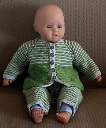 This is a cute baby jacket worked from top down with raglan shape sleeves. The yoke is worked in two colors and the rest of the body is worked in one color, making it easy and beautiful. The pants are worked in bi-color garter stitch just like the yoke.