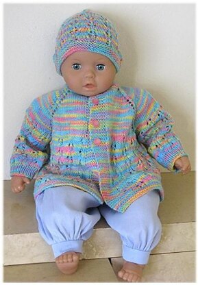 This baby jacket has a raglan shape and is worked from the neck down. After finishing the yoke, the body and sleeves follow an easy yet beautiful lace pattern that adds to the beauty of the design. In addition, the matching hat follows the same eyelet pattern.