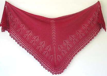 This is a triangular shawl worked from the top to the bottom edge. The increases are done at the center of the shawl creating a beautiful design decorated with beads. Then, a lace pattern is worked with a beautiful edging finishing the shawl.
