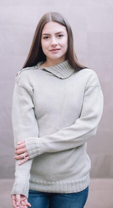 Seren is a simply gorgeous sweater featuring a split turtleneck. Worked in stockinette, the split at the shoulder is buttoned up with colorful buttons of your choosing that go all the way up the 2×2 ribbed neck.