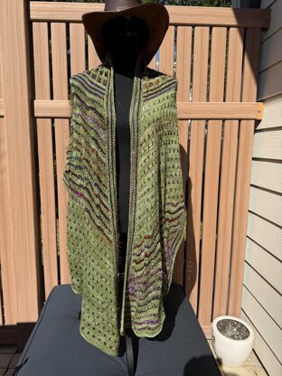 A wonderful long wide wrap using Prism Light Stuff and Prism Sheena. Light stuff is made up of various yarns in a DK weight, ribbons, wools, cottons, rayons etc.... Sheena is made up of silk and rayon. Both are so much fun to work with. Wrap measures about 90 inches long, 14 inches in the slanting sections and 18 inches in the back section.