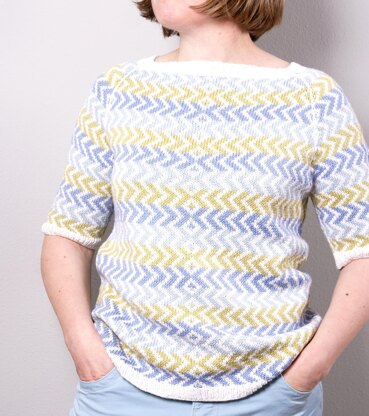 Kaiso is a short sleeve, square neck pullover knit using four colors of fingering weight yarn. The stranded pattern, which is reminiscent of seaweed, adds interesting stripes as well as a central motif on the front, back, and sleeves.