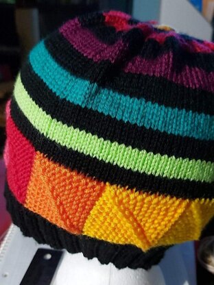 The hat has 10 mitred squares and you can choose to use as few or as many colour as you have in your stash.