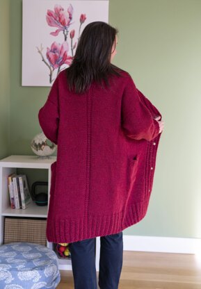 Kallina is a long oversized cardigan with pockets and accent rib at the back, worked from the bottom up. The entire body, including the front bands, is worked in one piece to the underarms, then the fronts and the back are worked separately with short row shoulder shaping. The shoulders are joined using the 3-needle bound-off, the sleeves are picked up around the armholes and worked in the round.