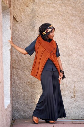 Tucks, reverse stockinette stitch and I-cords adorn this vest that is knitted sideways with a large garter stitch collar and a hem. Named Kanaye – Japanese for the zealous one – as the vest with its waterfall fronts can be used as a shawl or even upside down and closed with a shawl pin. The textured vest is worked in two parts and joined at the center back with a decorative I-cord on top. Kanaye is knitted in the airy Ask from Hillesvåg Ullvarefabrikk.