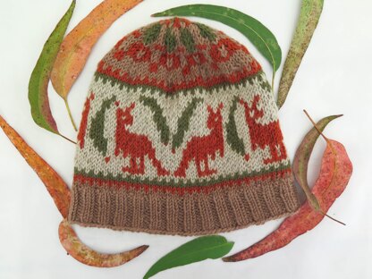 I do like Scandinavian Design and stranded Knitting Patterns. Living in Australia, I was getting a bit tired of all the reindeer featuring on hats and thought, I should come up with a more fitting theme for down under. So I chose the beautiful, stunning Red Kangaroo, mixed in a few Eucalyptus leaves and created this beanie pattern! I hope you like it. Sizes: 3/5 - 6/9 - 10/12 years ( largest size will fit small adult, women's) Head circumference: 50/52 - 53/54 - 55/56 cm or 19 3/4-20-1/2, 20 3/4-211/2, 21 3/4- 22 1/4 inches Materials: DK Wool 50 g each for all sizes of the following colours: olive green, rust, light green and 100 g in mid brown DOUBLE POINTED NEEDLES and CIRCULAR NEEDLE, 40 cm or 16" SIZE 3 mm or US 2.5 Tension/Gauge: 23 sts x 32 rows in stocking st = 10 x 10 cm.