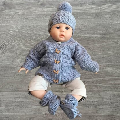 Kasey cardigan, hat and booties crochet pattern set for preemie to 10 years, with booties to 12 months sized by hook. A coordinated set for everyday wear and thoughtful handmade baby gifts.