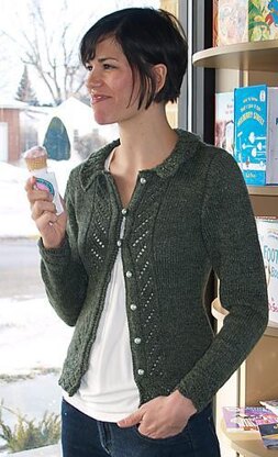 This feminine fitted cardigan has lace panels accenting the front and hem. Set-in sleeves, worked top down from body with short-row shaping on caps feature simple lace trim on cuffs.