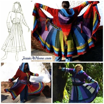 This fun, fanciful, Faerie Frock will bring out the whimsy in you! It features vertical stripes of knit panels in the skirt, which are connected as they are made, thus there is no need to have multiple balls of yarn all being used at the same time. The frock can be made with or without a hood and there are many variations on the skirt, hood, and sleeves. Several line drawings are included so you can plan out your colors. As for the number of colors needed, you can do what makes you happy; use a different color for every part, or use just two or three colors for the panels or even stash~bust and wing it! The whole point of this pattern is to have fun and to bring some joy to the one who gets to wear it.
