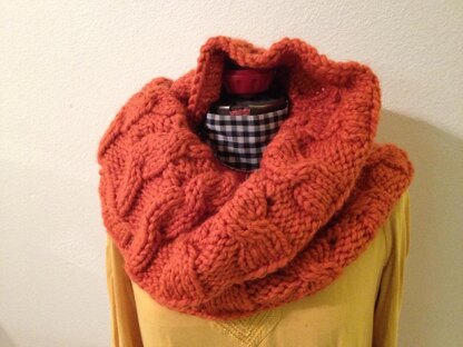 This seamless moebius cowl is knit on a circular needle, using a reversible cable pattern over a 4/4 rib. It is a thick, rich and warm, and has a wonderful twist. The green version is longer, more narrow, (knit up to round 15 only) and wraps around your neck twice.