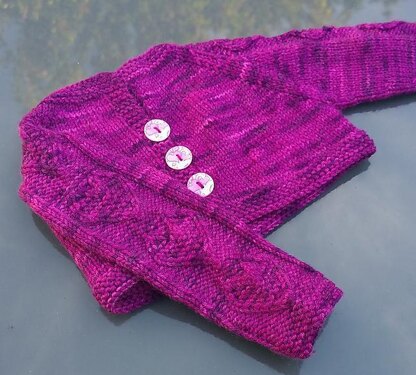 Katren is the tender-hearted character from [The Ancient Future by Traci Harding][1], a well-loved book of mine. When thinking of Katren, hearts come to mind, as she is a kind, sweet heart and the mother hen of the Chosen. Rags to riches, this cropped cardigan shows the elegance of being a lady with the practical long sleeves of a commoner. Designed to keep the chest and heart warm of your little one, the cute, single cable pattern extends down the arms to the cuff, showing everyone a mother’s love, just like Katren’s.
