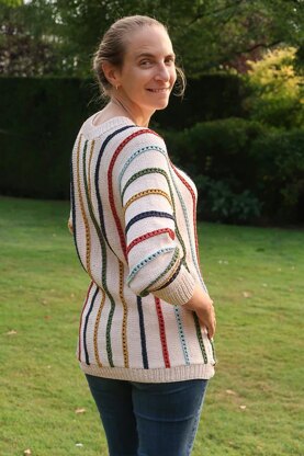 Worked flat in 2 panels sideways from cuff to cuff, the unusual construction makes these beautiful yet extremely easy vertical eyelet stripes possible. Sized XS to 5XL the Katrina Sweater is an easy-level knitting pattern.