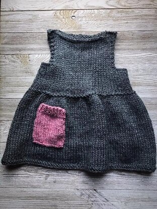 It is written in standard knitting terms in English. This little dress is knit in one piece with seaming only up the sides. It is for sizes 0-3m, 3-6m, 6-12m, 12-18m, and 18-24m This little dress/jumper is a great layering piece making it a year-round dress. It has directions for an optional pocket. It uses worsted weight yarn and US 7 (4.5mm) needles.