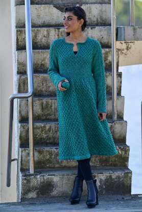 Keila is Norse for straight, just as the skirt part of this honeycomb dress is. Elongated honeycomb covers the skirt, while ray of honey makes the high waistband, both are worked in the round. The pattern flow continues with a body in honeycomb including armhole stitches in stockinette stitch. Keila is worked flat from the armhole and ends in a Henley neck. Only the center of the sleeve has a honeycomb panel. Wear the dress as a balloon dress or a tunic by inserting a cord into the double hem. Keila is knitted in the bouncy Sølje, a pelt wool yarn, from Hillesvåg Ullvarefabrikk.