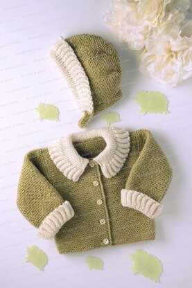 Product for digital download containing the instructions to make a chic woollen jacket with matching hat in khaki and ivory, for a baby of 2 to 4 months. The instructions include the description of the materials required to make the outfit and the needle size used.
