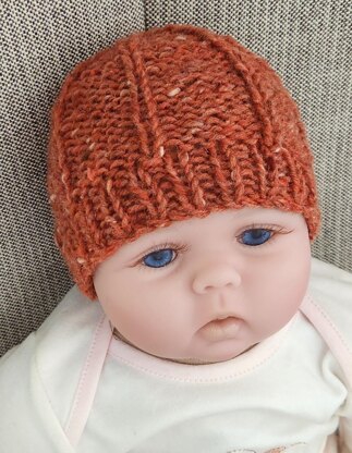 This easy knit, thick and warm, unisex baby Beanie has a 1x1 rib brim then is worked in an easy 5x1 rib stitch.