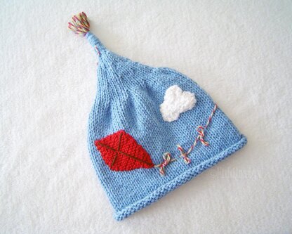 This fun pixie hat is knit in the round in simple stockinette. The kite’s tail wraps around to become a fanciful topper. The clouds are done using simple crochet stitches. The kite is knit separately and sewn on later.