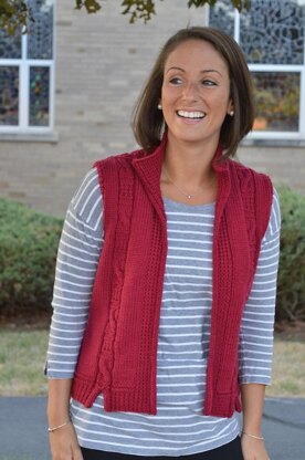 Cables, texture, a cozy collar to keep out the chill - what could be better for the cool early mornings of late summer or the crisp afternoons of autumn. Knit in aran weight, this vest is a quick project, with a few details to add spice.