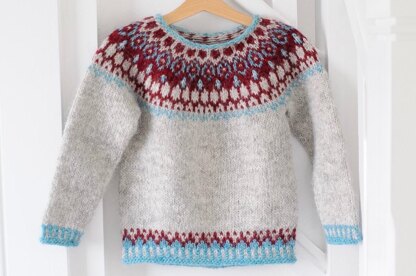 Kerid is an Icelandic sweater for children, named after the volcanic crater lake in Iceland. Its traditional Icelandic yoke is reminiscent of the vivid redness of the crater slopes against the intense azure colour of its lake.